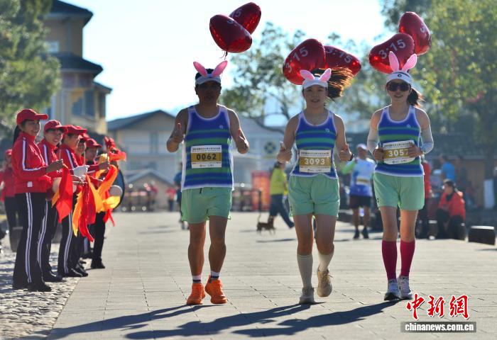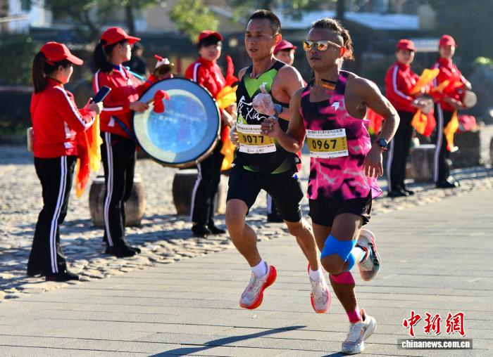 图为参赛选脚从下北土楼群旁通过。(无人机相片)中新社记者 弛斌 摄