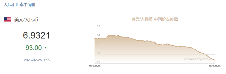 [ 2月25日人民币对美元中间价报6.9321元 上调93个基点 ]